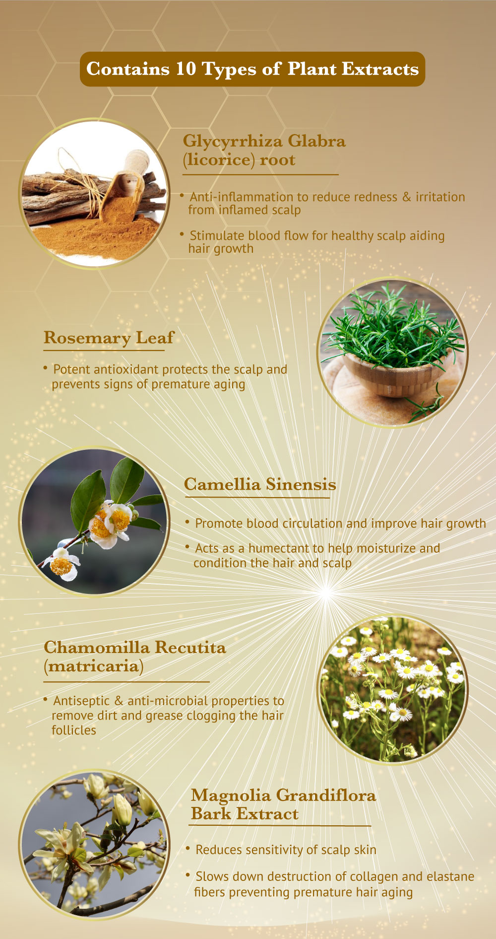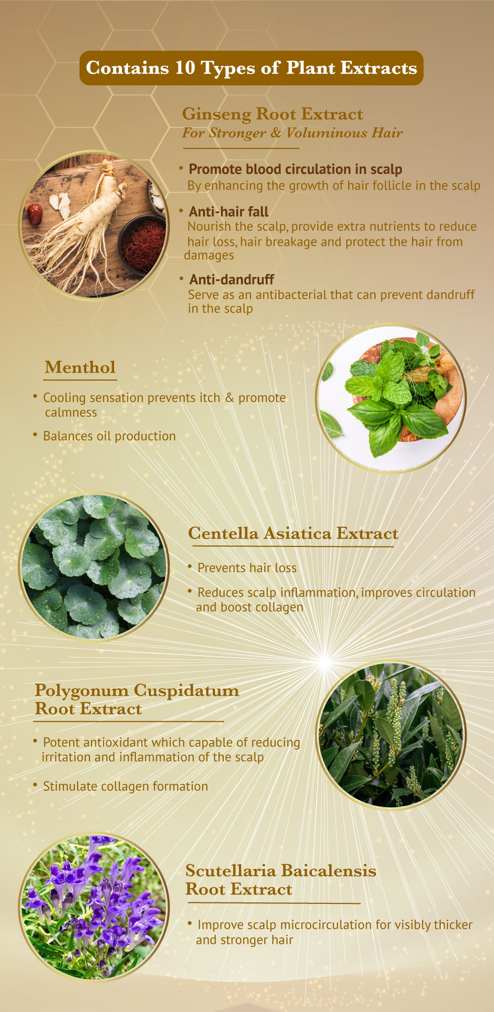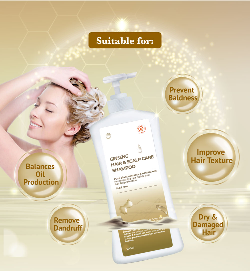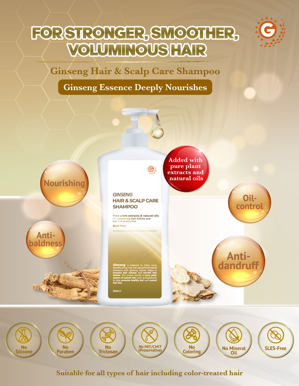 Ginseng is believed to bring many benefits to our hair. Our special formulated shampoo with ginseng extract helps to increase hair volume, nourish hair follicle and remove dandruff. The unique blends of pure plant extract & natural oils work synergistically to help promote healthy hair, control hair loss, and balances oil production. Suitable for all types of hair including color-treated hair.