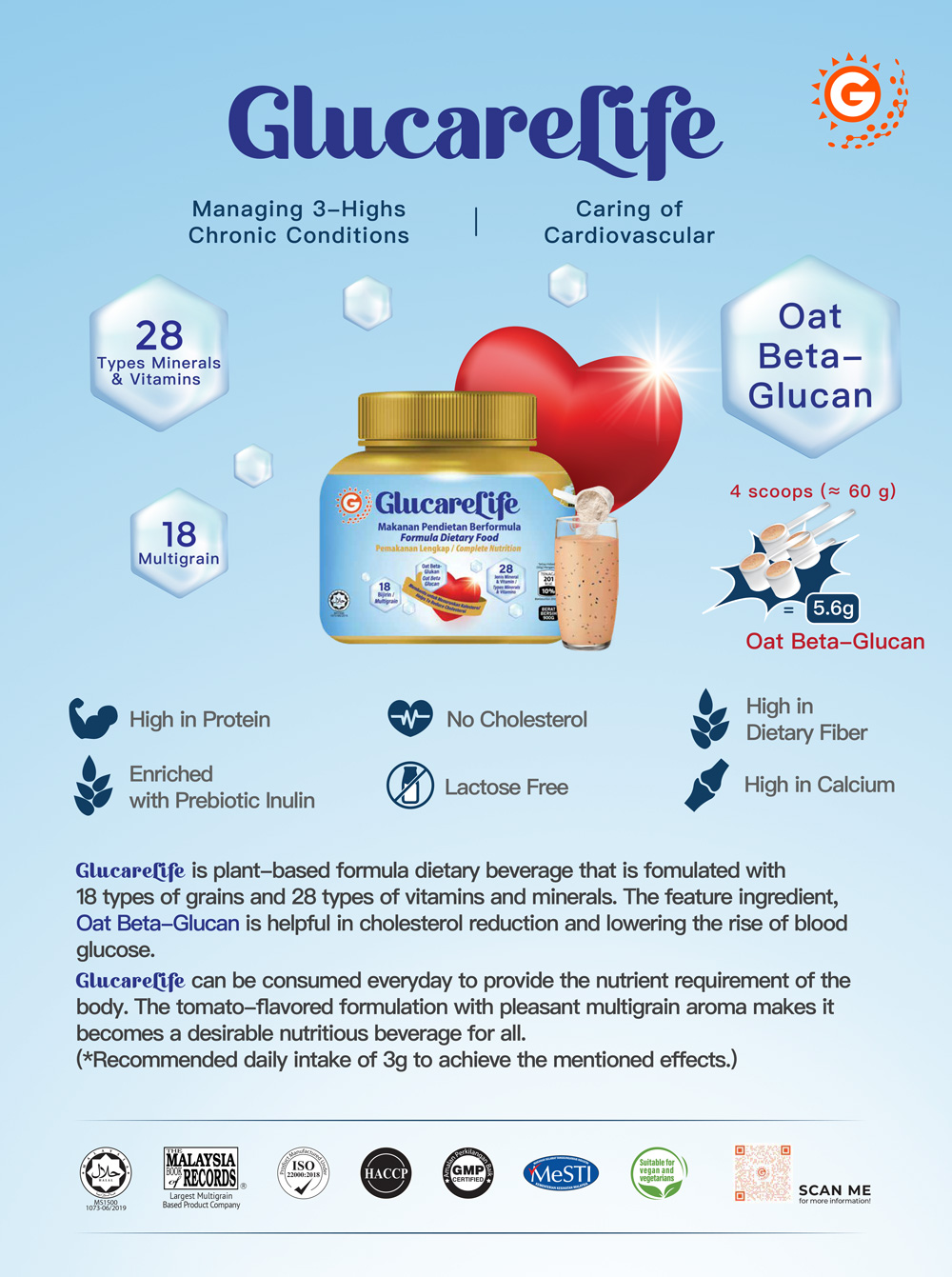 GlucareLife is a plant-based formula dietary beverage that is formulated with 18 types of grains and 28 types of vitamins and minerals. The feature ingredient, Oat Beta-Glucan* is helpful in cholesterol reduction and lowering the rise of blood glucose. GlucareLife can be consumed everyday to provide the nutrient requirement of the body. This tomato-flavored formulation with a pleasant multigrain aroma makes it a desirable nutritious beverage for all. (*Recommended daily intake of 3g to achieve the mentioned effects)