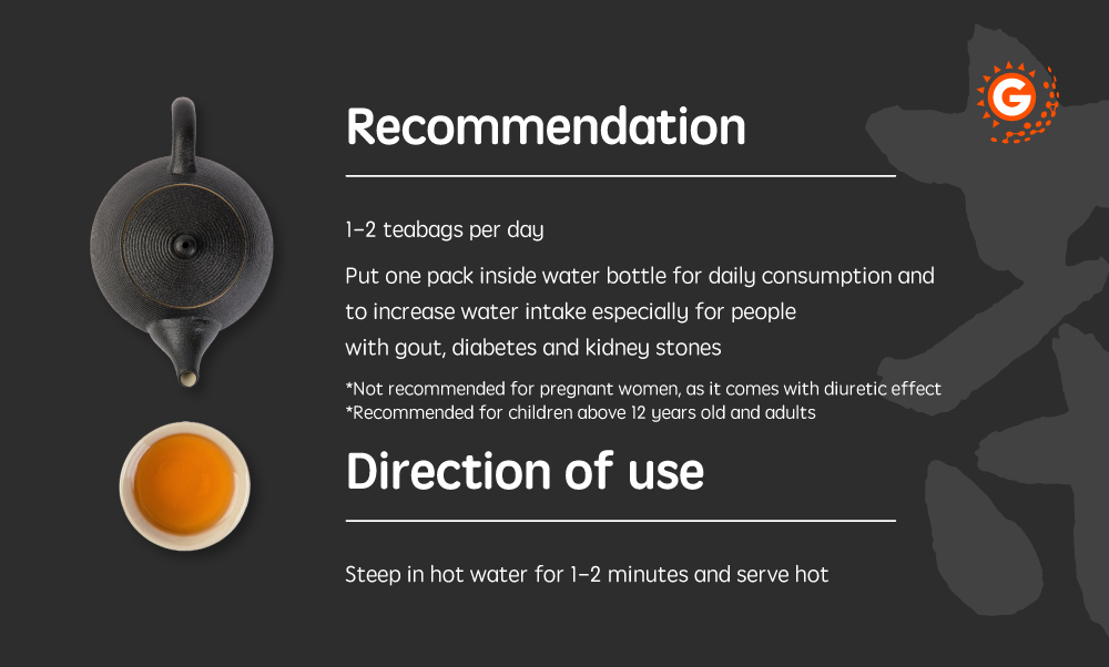Direction of use: Put 1 teabag in hot water, steep for 1-2 minutes and serve hot. Take 1-2 teabags per day.