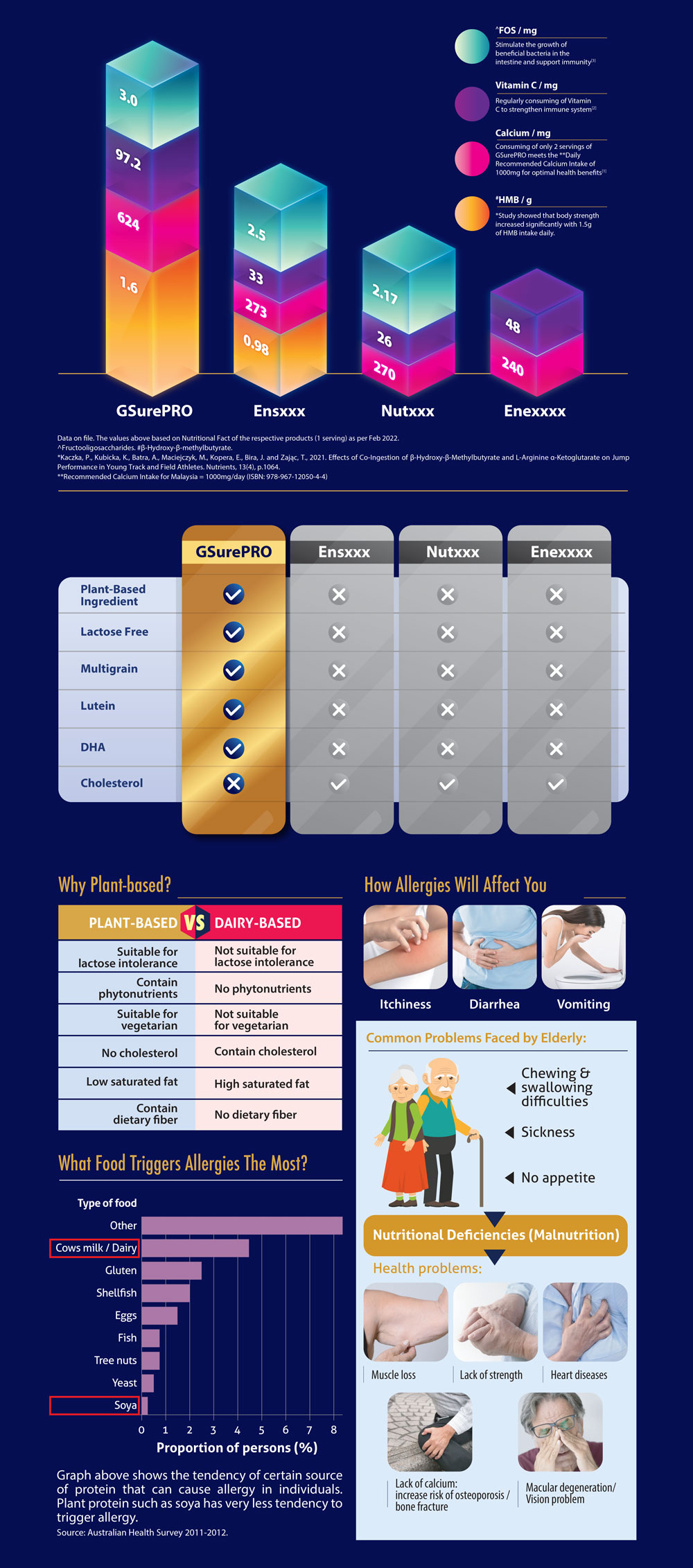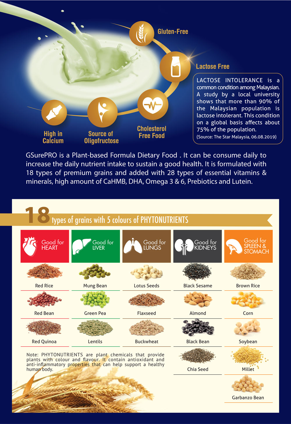 GSurePRO is a Plant-Based Formula Dietary Food . It can be consumed daily to increase the daily nutrient intake to sustain a good health. It is formulated with 18 types of premium grains and added with 28 types of essential vitamins & minerals, high amount of CaHMB, DHA, Omega 3 & 6, Prebiotics and Lutein.
